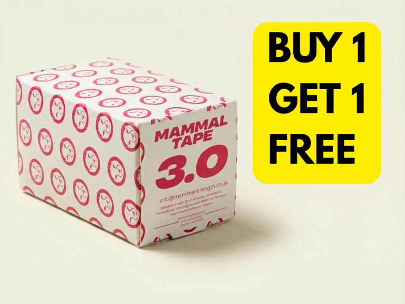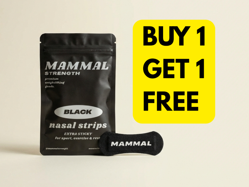 Buy 1 get 1 free Mammal Strength training gear promotion featuring Mammal Tape and nasal breathing strips